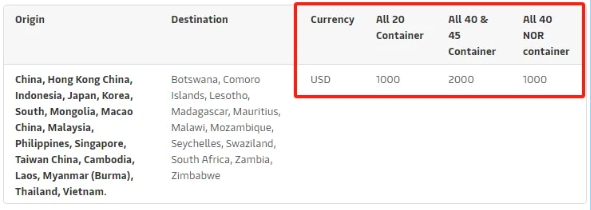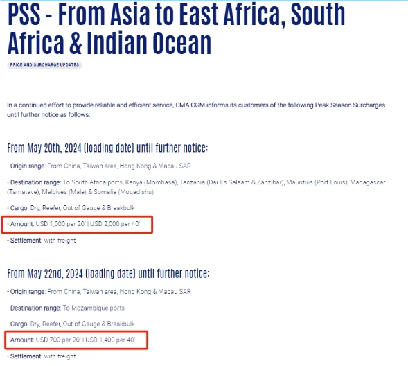 - 2024年5月20日(裝貨日期)起,至南非港口、肯尼亞(蒙巴薩)、坦桑尼亞(達(dá)累斯薩拉姆和桑給巴爾)、毛里求斯(路易港)、馬達(dá)加斯加(塔馬塔夫)、馬爾代夫(馬累)和索馬里(摩加迪沙)的干箱、冷藏箱、超限貨物和散雜箱,每20英尺箱1000美元、每40英尺箱2000美元。