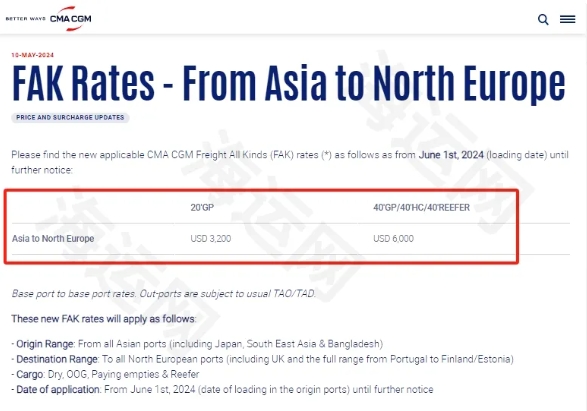達(dá)飛官網(wǎng)發(fā)布通知稱,2024年6月1日起(始發(fā)港裝貨日期),調(diào)整從亞洲到北歐新的FAK費(fèi)率,高達(dá)6000美元/FEU。