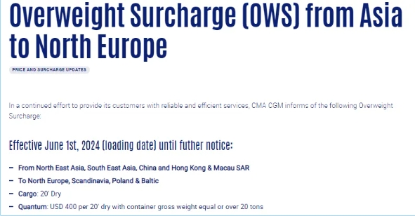 達(dá)飛自2024年6月1日(裝載日期)起,征收亞洲至北歐超重附加費(fèi)(OWS),集裝箱毛重等于或超過20噸,每20英尺干散貨箱400美元,直至另行通知