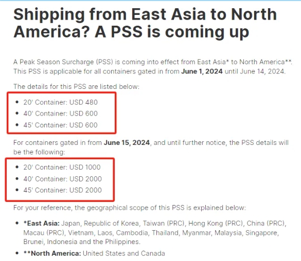 - 2024年6月1日起至6月14日入場:20'集裝箱:480 美元;40'集裝箱:600美元;45'集裝箱:600美元