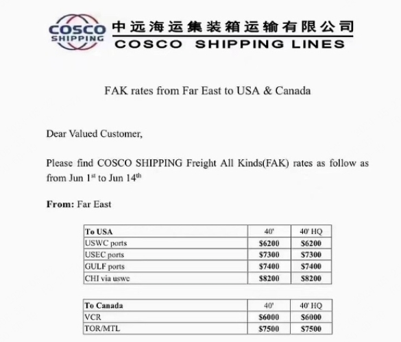 - 華南地區(qū):2024年5月15日(裝貨日期)起,每20英尺干箱500美元。2024年5月18日(裝貨日期)起,每20英尺干箱1500美元。