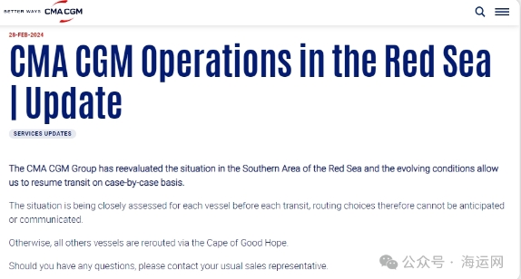法國集裝箱巨頭達(dá)飛輪船(CMA CGM)已恢復(fù)在沖突頻發(fā)的紅海地區(qū)的航行。該公司在其官方聲明中表示,經(jīng)過重新評估南紅海的局勢,決定在符合具體情況的基礎(chǔ)上恢復(fù)紅海航行。達(dá)飛輪船強(qiáng)調(diào),每次過境前都會對船舶情況進(jìn)行細(xì)致的評估,但無法預(yù)測或公布航線的選擇。值得注意的是,總部位于阿曼的Asyad航運(yùn)公司在致客戶和業(yè)務(wù)合作伙伴的一封信中承諾可安全通過充滿風(fēng)險(xiǎn)的紅海航行。