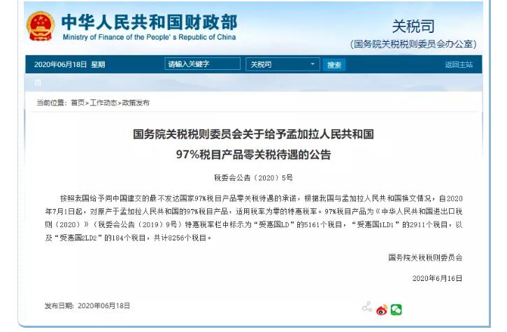 6月18日,【國務(wù)院關(guān)稅稅則委員會:給予孟加拉國97%稅目產(chǎn)品零關(guān)稅待遇】按照我國給予同中國建交的最不發(fā)達國家97%稅目產(chǎn)品零關(guān)稅待遇的承諾,根據(jù)我國與孟加拉人民共和國換文情況,自2020年7月1日起,對原產(chǎn)于孟加拉人民共和國的97%稅目產(chǎn)品,適用稅率為零的特惠稅率。