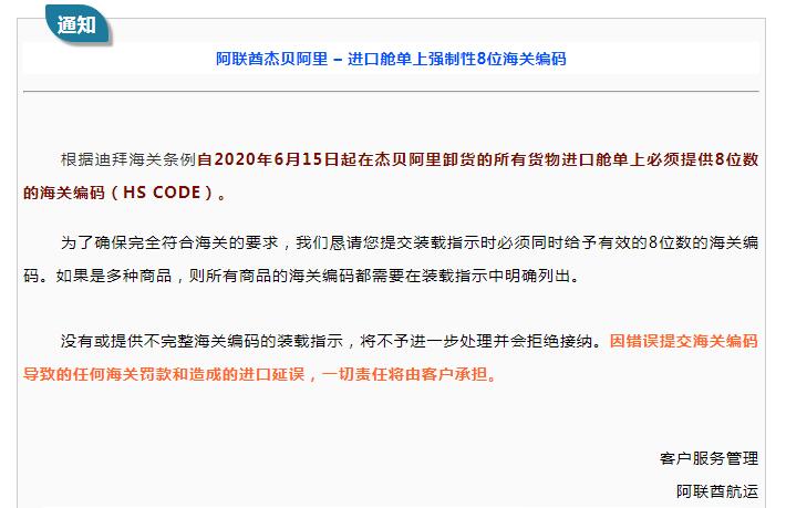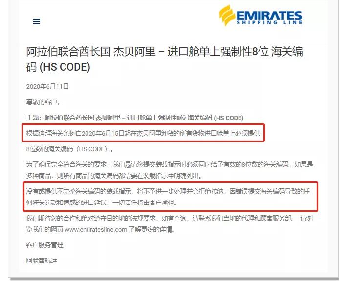 根據迪拜海關條例自2020年6月15日起在杰貝阿里卸貨的所有貨物進口艙單上必須提供8位數的海關編碼(HS CODE)。為了確保完全符合海關的要求,在提交裝載指示時必須同時給予有效的8位數的海關編碼。如果是多種商品,則所有商品的海關編碼都需要在裝載指示中明確列出。
