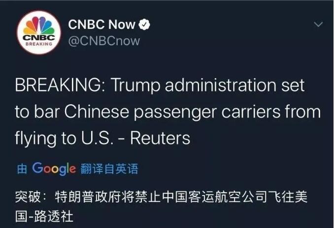 于是,美國政府6月3日發(fā)布消息,從6月16日起禁止中國航班飛往美國。由此可見,美國此次發(fā)布禁止中國航班飛往美國的消息,是對中國沒能答應(yīng)于6月1日通航中國三大主要城市的回擊。看似是給予中國的回擊,但實質(zhì)上卻是給自己找臺階下而已。