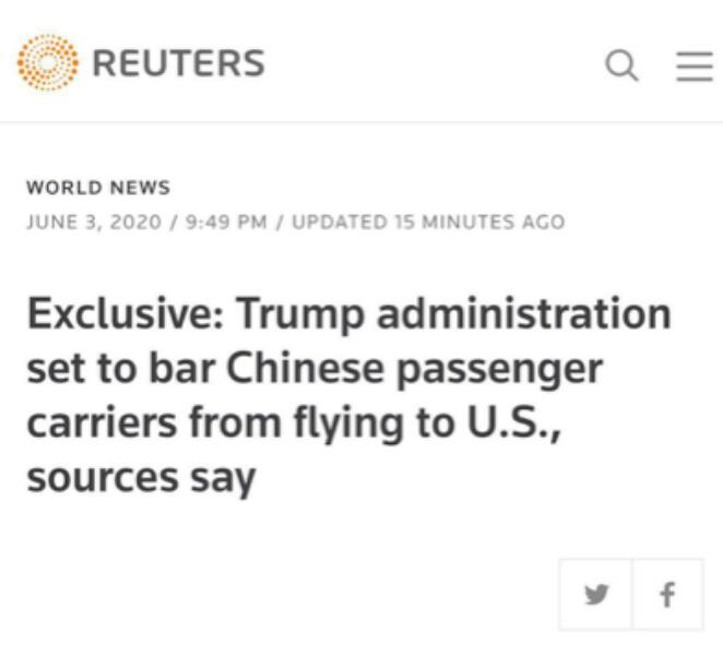 上述命令宣稱,美國交通部因中國政府“未能允許美國承運人實現(xiàn)往返中國的定期客運航空服務(wù),無法行使雙邊權(quán)利的全部內(nèi)容”,將暫停所有中國航空公司往返美國的定期航班運營。該命令將于2020年6月16日生效。