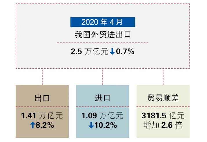 4月份,我國外貿(mào)進(jìn)出口2.5萬億元,同比微降0.7%;其中,出口1.41萬億元,增長8.2%;進(jìn)口1.09萬億元,下降10.2%;貿(mào)易順差3181.5億元,增加2.6倍。