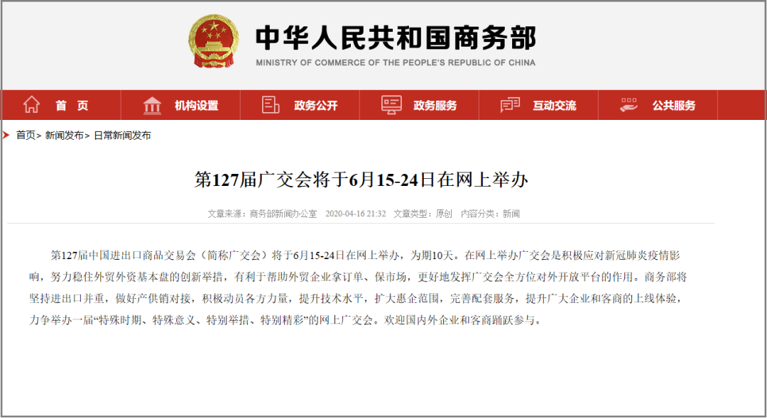 往年,春季廣交會都于4月15日開幕,今年由于疫情原因,第127屆廣交會將于6月15日至6月24日,并且首次在網(wǎng)上舉辦。