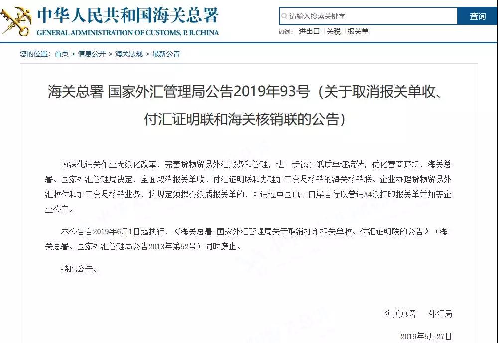 剛剛,海關(guān)總署、外匯局發(fā)布了關(guān)于取消報(bào)關(guān)單收、付匯證明聯(lián)和海關(guān)核銷聯(lián)的公告!
